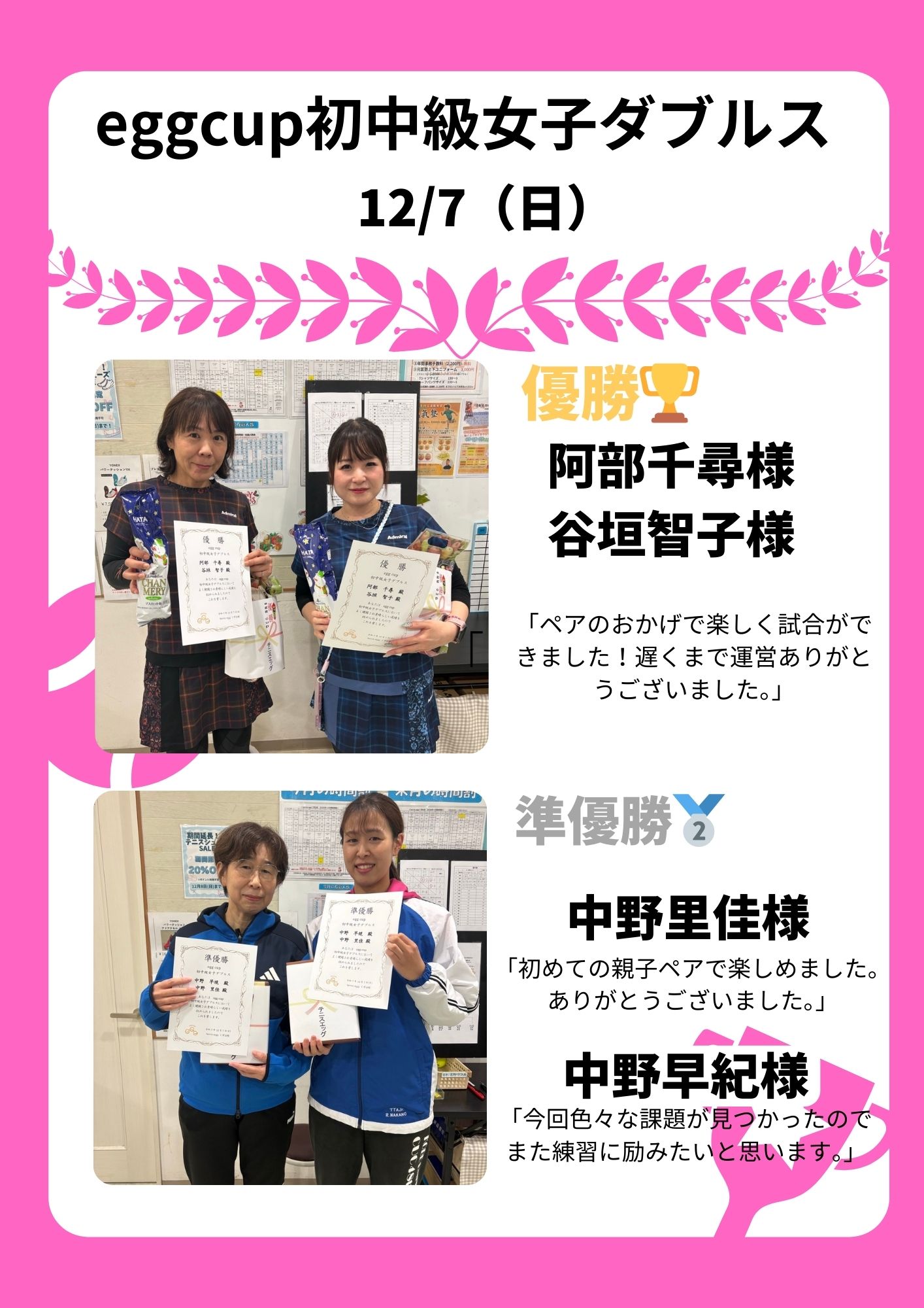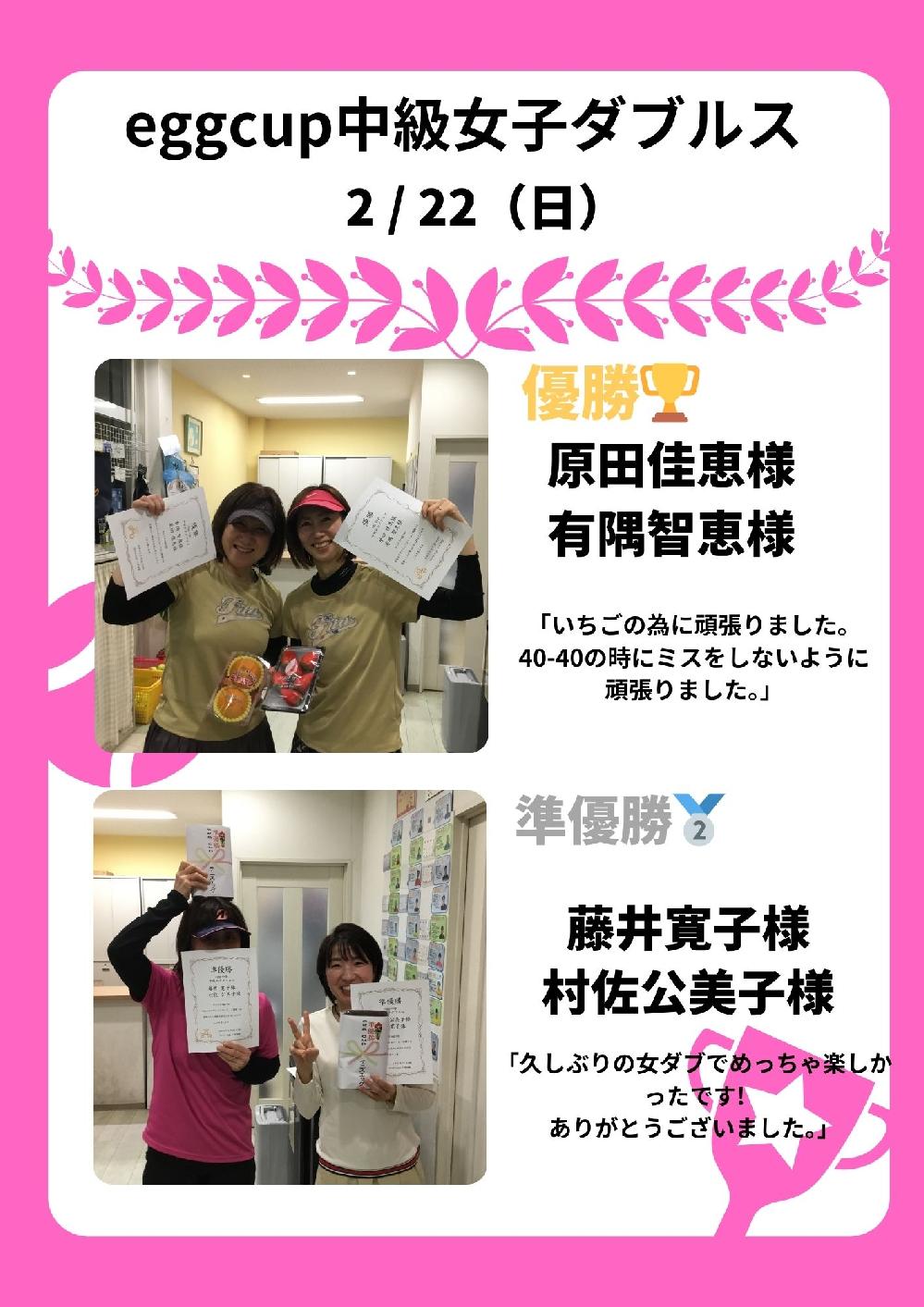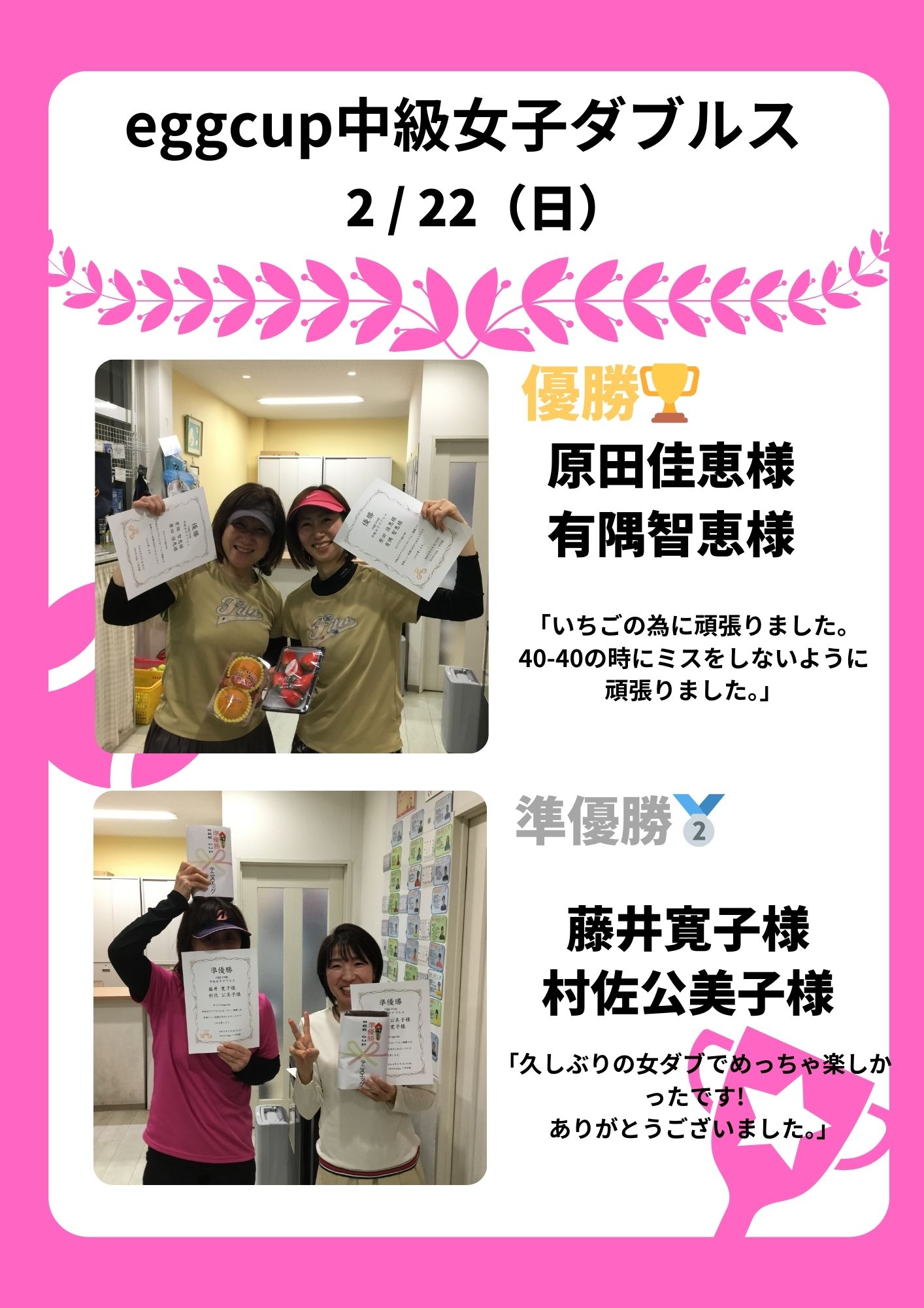 優勝 川人 一也様 初優勝嬉しいです。 今宮 香澄様 「ペアのおかげです。ありがとうございました。」